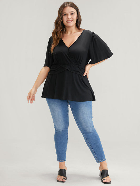 Solid Ruffles Bell Sleeve Button Cold Shoulder T-shirt