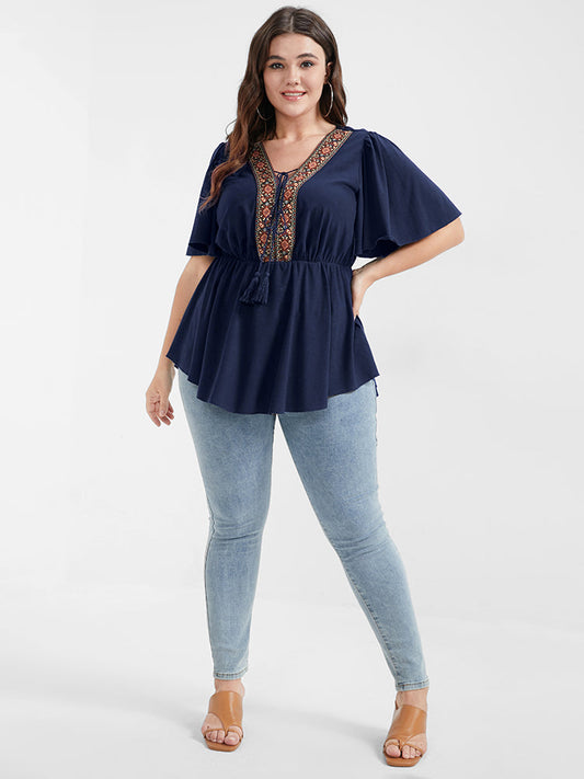 Solid Flutter Tassel Ties Embroidered V Neck T-shirt