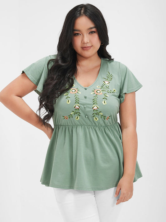 Plain Babydoll Embroidered Ruffles Button V Neck T-shirt