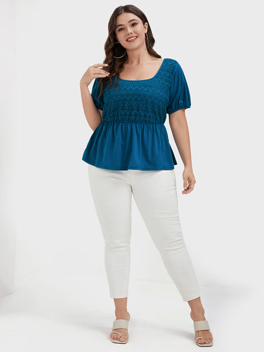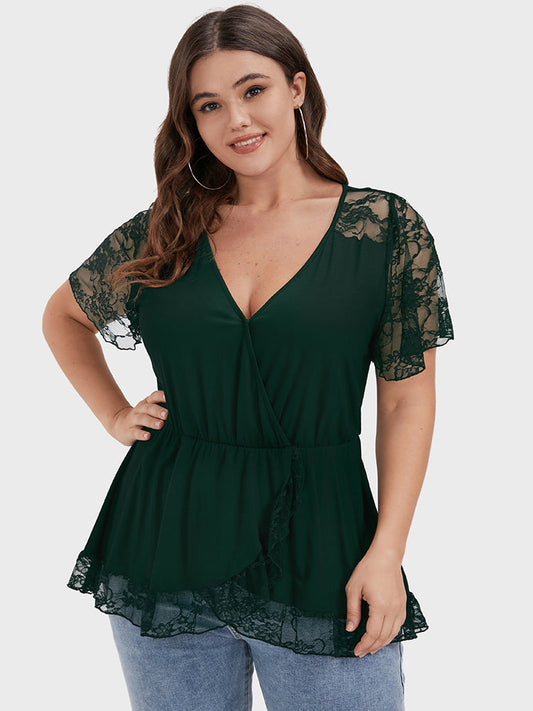 Plain Ruffles Puff Sleeve Lace Round Neck T-shirt