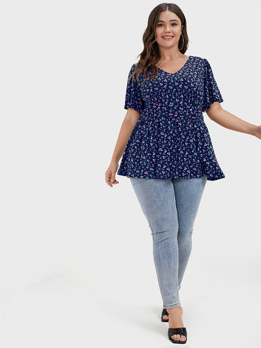 Ditsy Floral Ruched Ruffles V Neck T-shirt