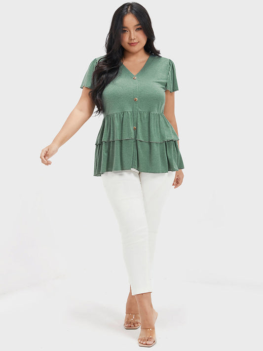 Solid Ruffles Tiered Button V Neck T-shirt