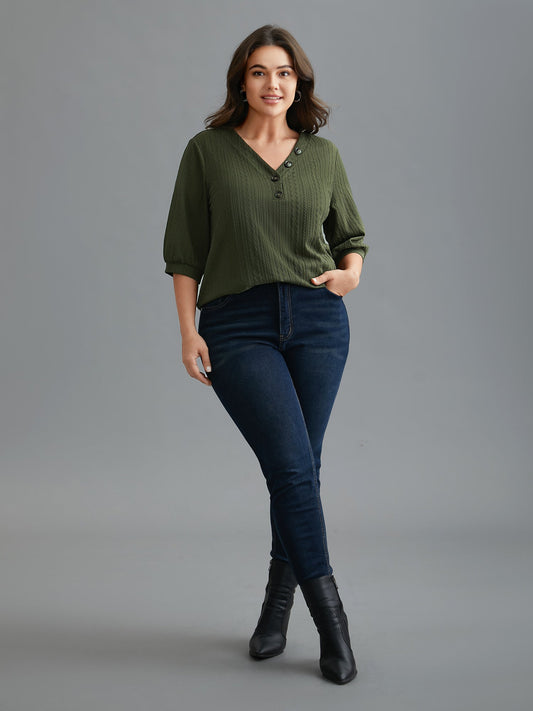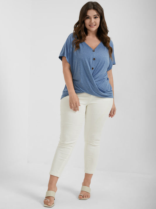 Solid Button Twist-front Dolman Sleeve V Neck T-shirt