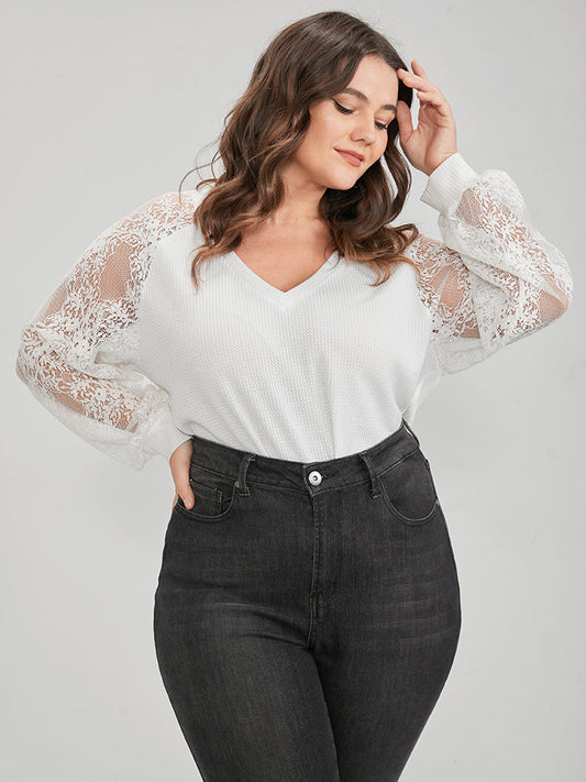 Solid V Neck Contrast Lace Raglan Sleeve Long Tee
