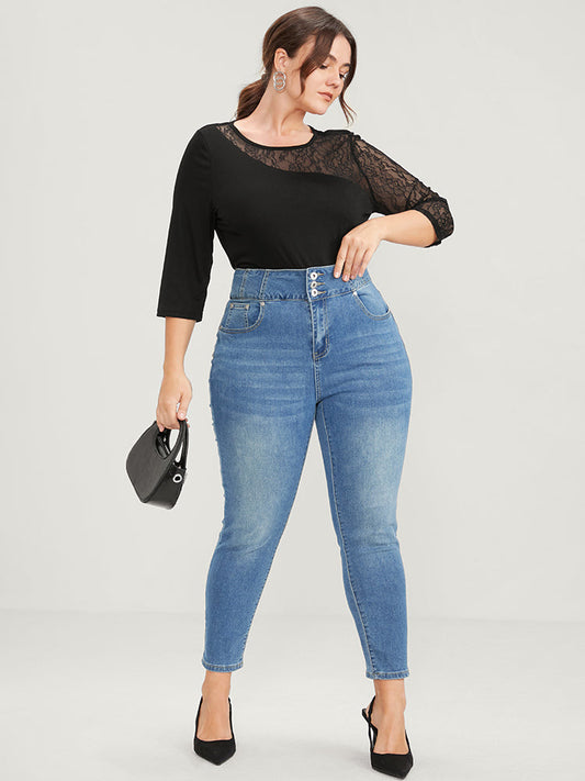 Solid Asymmetrical Lace Patchwork Round Neck T-shirt