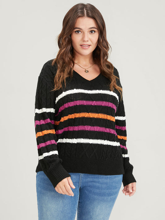 Striped Contrast Pointelle Knit Ties V Neck Knit Top