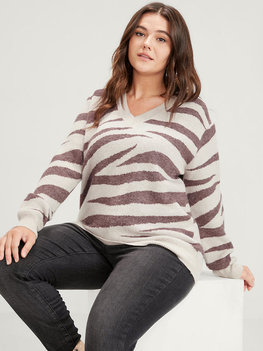 Zebra Print Contrast Pointelle Knit V Neck Knit Top