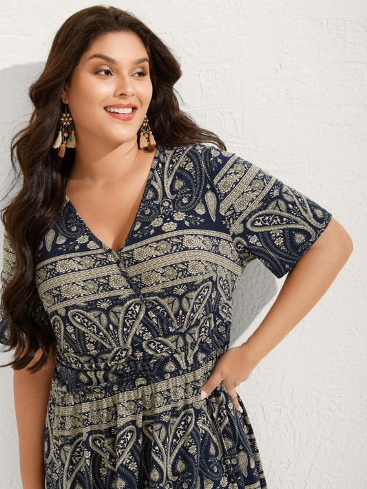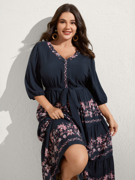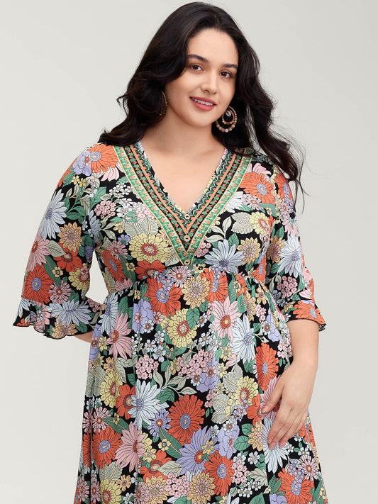 Floral Pattern Stretchy Waist Notched Maxi Dress
