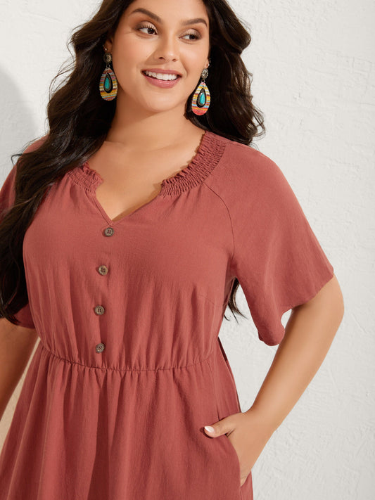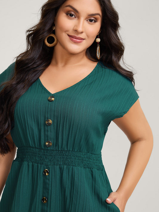 Textured Shirred Waist Button Midi Dress