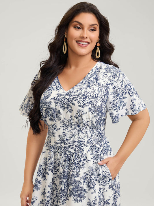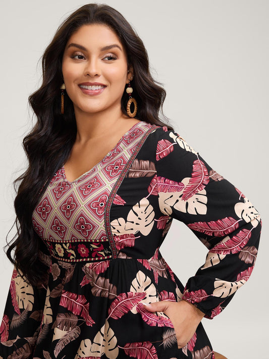 Floral Print Lace Trim V-Neck Midi Dress