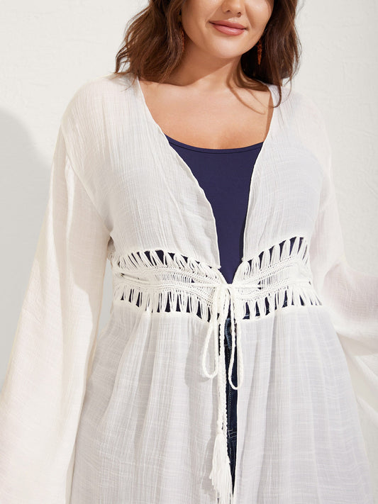 Crochet Lace-Up Tassel Tie Flared Sleeve Cardigan