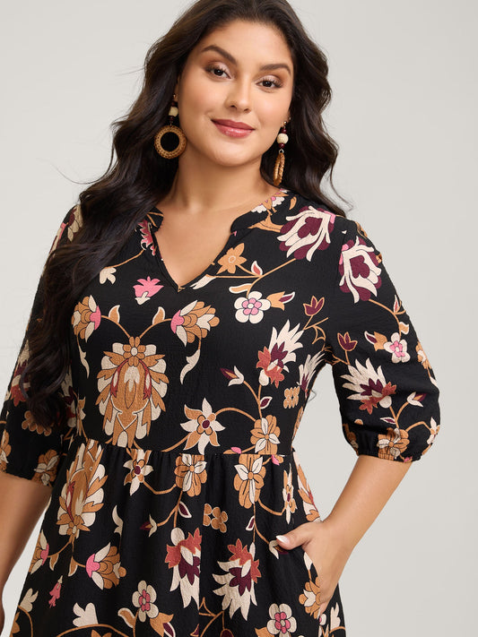 Midnight Floral Print Notched Collar Midi Dress