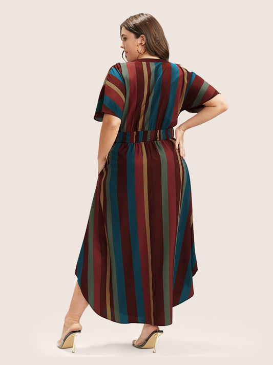 Asymmetrical Striped Bell Sleeve Pocket Split Surplice Neck Dress