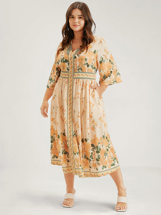 Floral Flutter Button Pocket V Neck Midi Dress