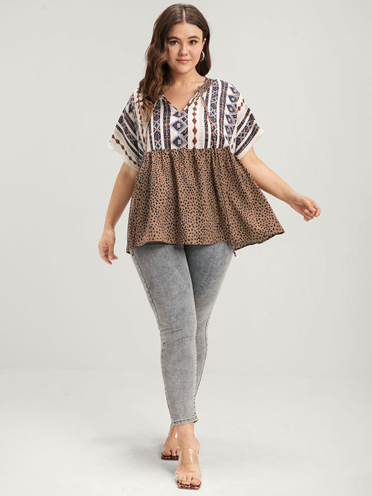 Leopard Geometric Contrast Elastic Waist Ties Neck Blouse