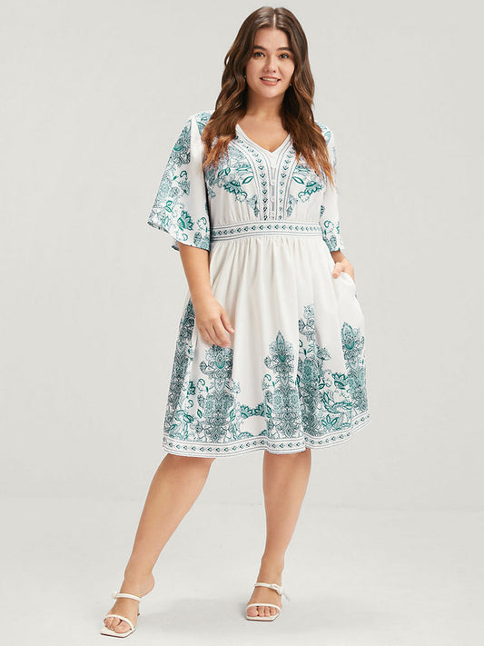 Floral V Neck Pocket Button Flutter Knee Dress