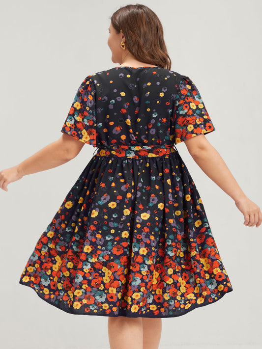 Floral Flutter Pocket Button Belted Wrap Knee Dress