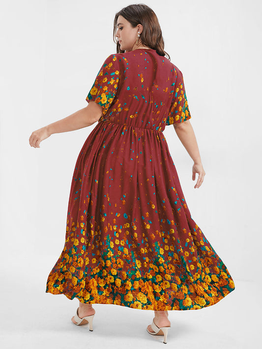 Ditsy Floral V Neck Pocket Button Ruffles Maxi Dress