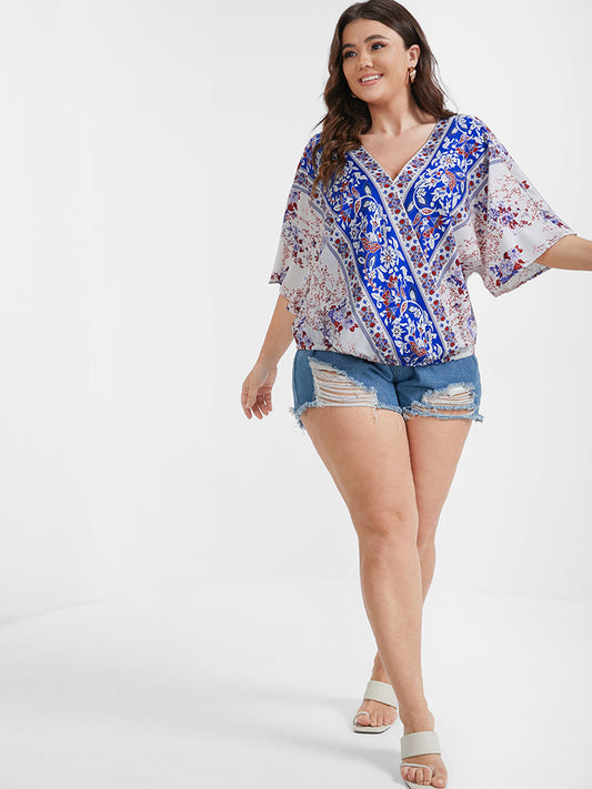 Floral Bell Sleeve Elastic Waist Button Wrap Blouse