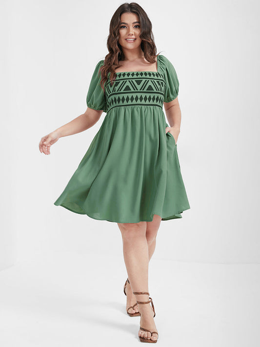 Geometric Printed Pocket Puff Sleeve Square Neck Dress