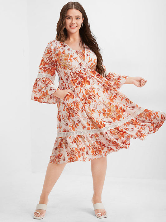 Floral Flutter Bell Sleeve Lace Pocket Knee Dress