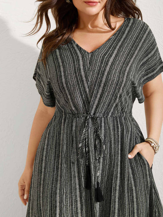 Neck-Tie Tassel Pockets Tiered Midi Dress