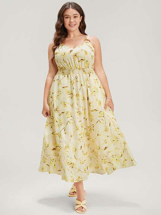 Floral Pocket Buckle Detail Shirred Lace Ruffles Cami Dress