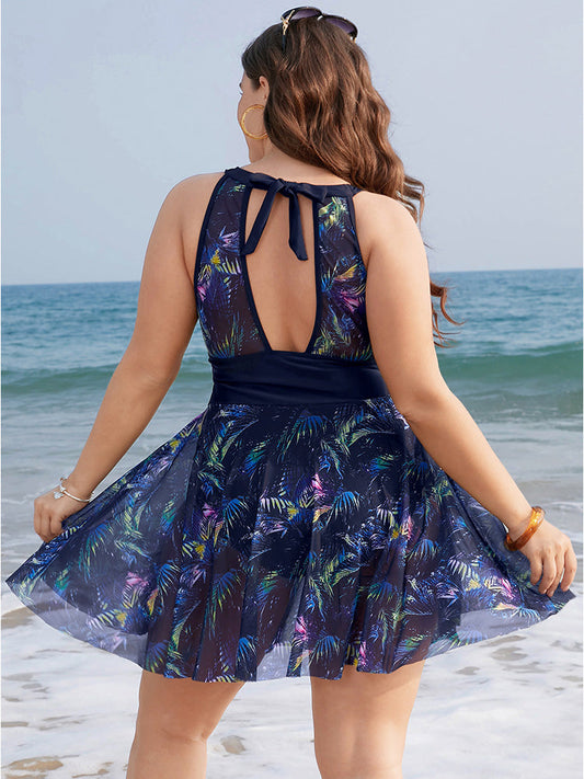Tropical Print Knotted Back Cut Out Halter Swim Dress