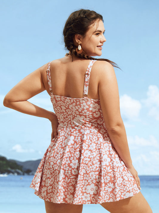 Floral Tie Knot Patchwork Ruffles Swim Dress