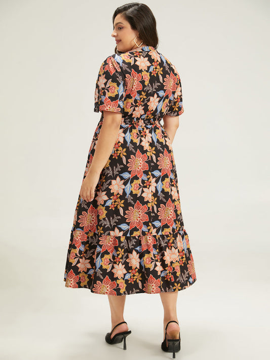 Floral Notched Plicated Detail Ruffle Cap Sleeve Dress