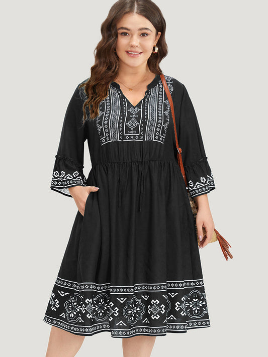 Bandana Print Knot Neck Frill Trim Bell Sleeve Dress