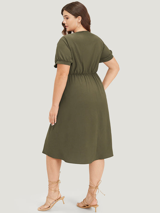 Plain Button Detail Pocket V Neck Gathered Lantern Sleeve Dress