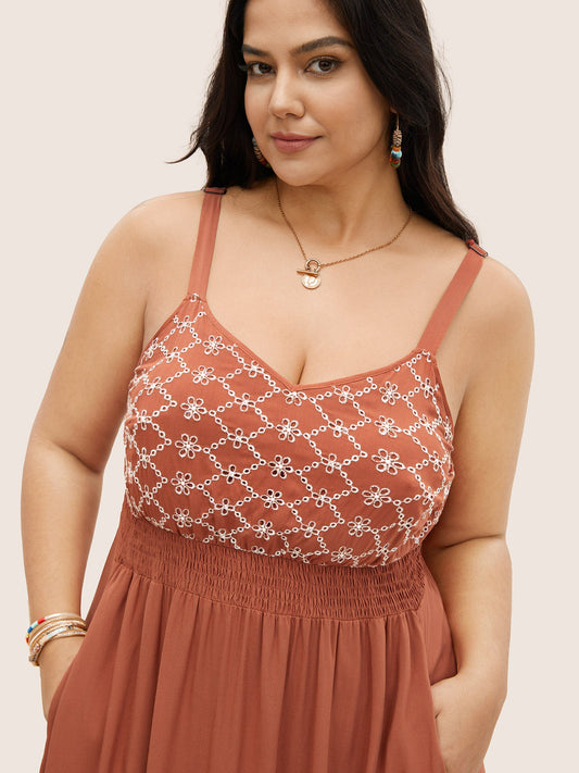 Floral Embroidered Shirred Patchwork Ruffle Hem Dress