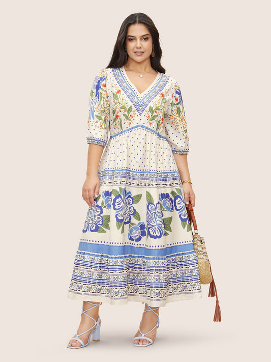 V Neck Floral Print Elastic Waist Lantern Sleeve Dress