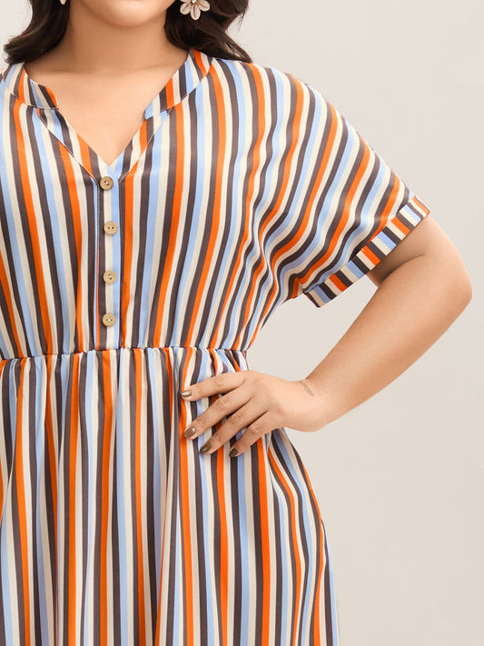 Stripes Notched Collar Pockets Midi Dress