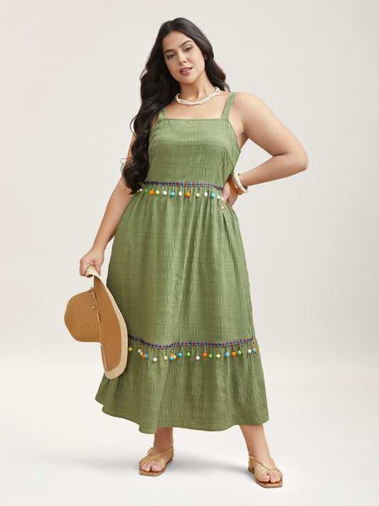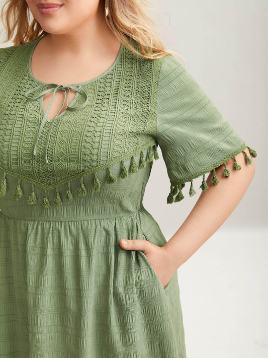 Lace Neck-Tie Pockets Tiered Midi Dress