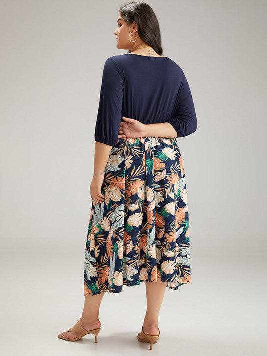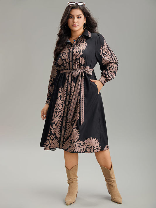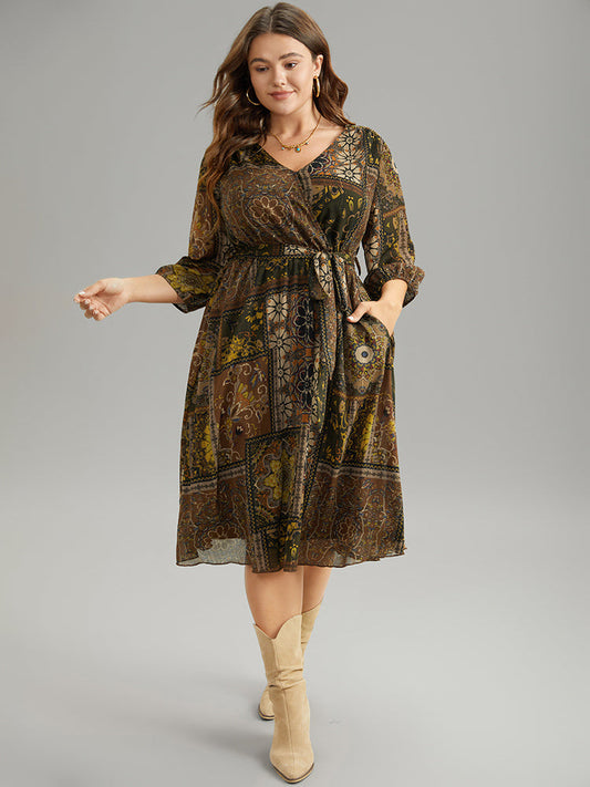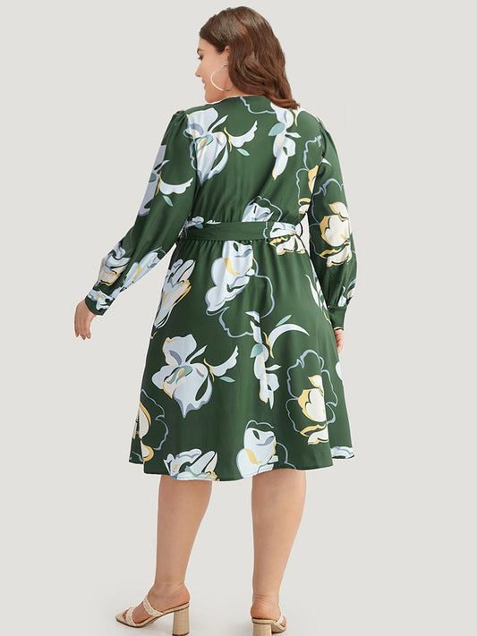 Floral Print Pleated Ties Wrap Lantern Sleeve Dress