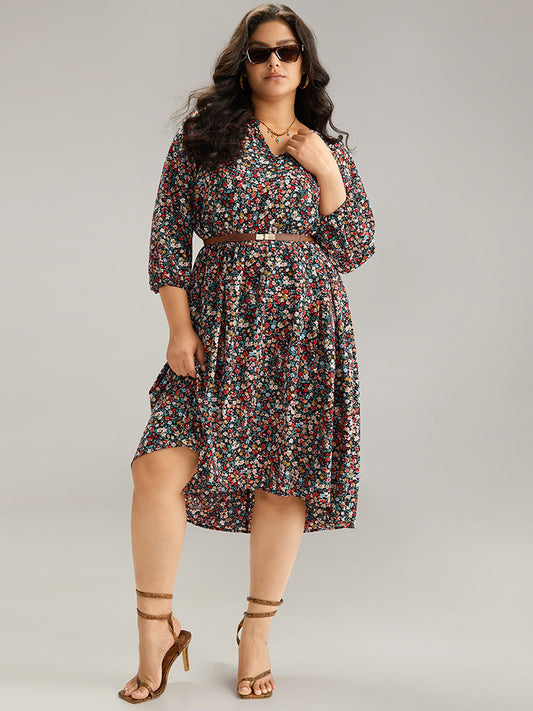 Ditsy Floral Pocket Lantern Sleeve Ruffle Hem Dress