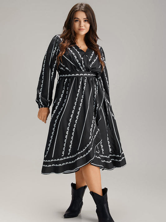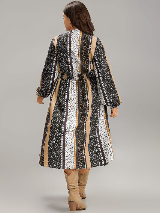 Boho Print Embroidered Wrap Lantern Sleeve Dress