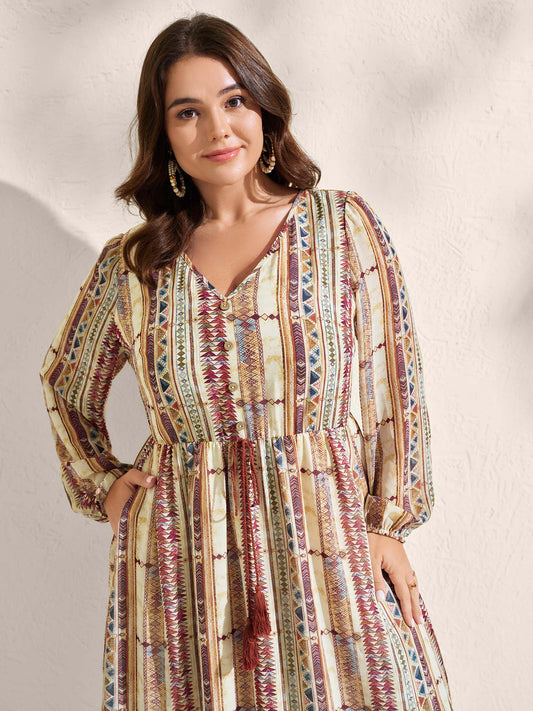 Geometric Stripes Stretchy Waist-Tie Maxi Dress