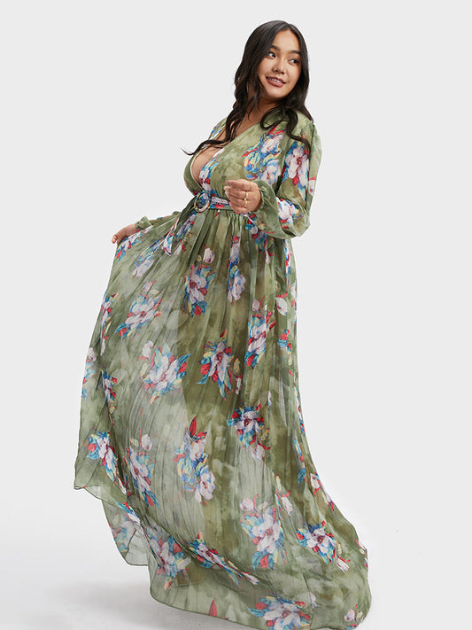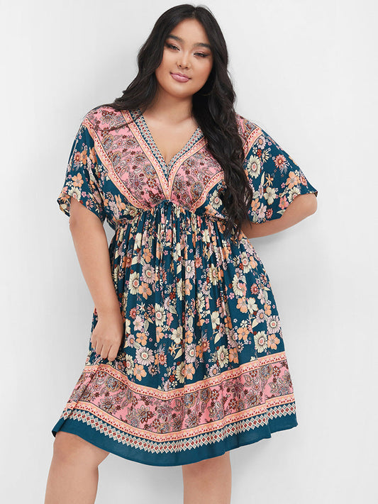 Floral V Neck Elastic Waist Pocket Ruffles Knee Dress