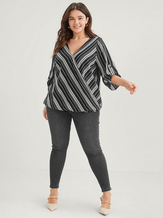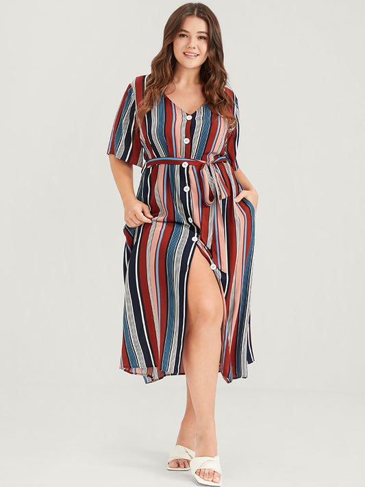 Striped Pocket Bell Sleeve Button Ruffles Hem Wrap Maxi Dress