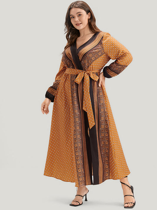 Geometric Split Pocket Belted Wrap Lantern Sleeve Dress