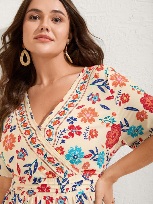 Floral Print Pleated Waist Surplice Blouse