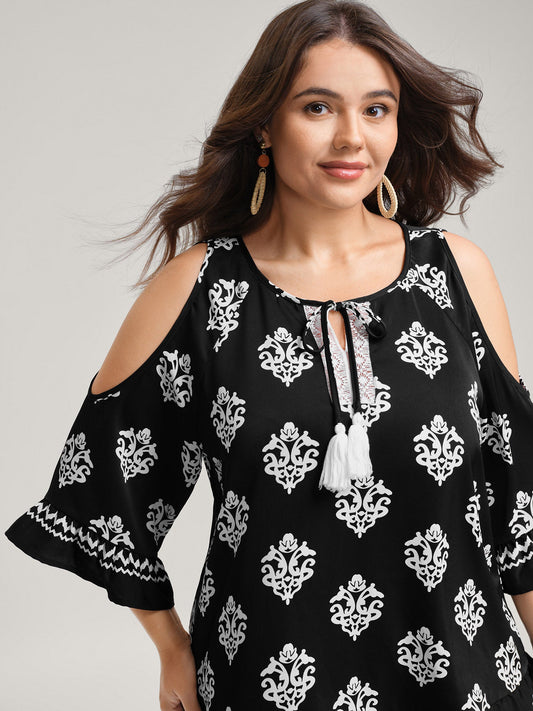 Floral Print Lace Neck Flared Sleeve Blouse