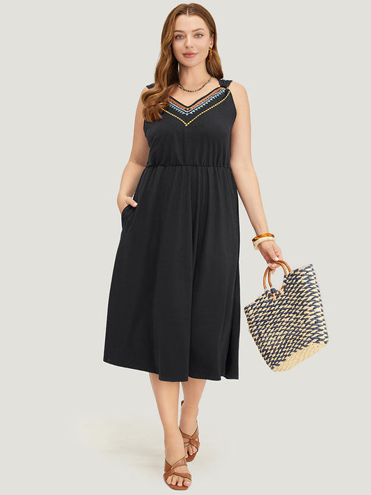 Geometric Embroidered Buckle Detail Pocket Ruffle Hem Cami Dress