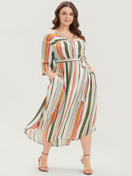 Striped Print Pocket Button Up Belted Midi Dress