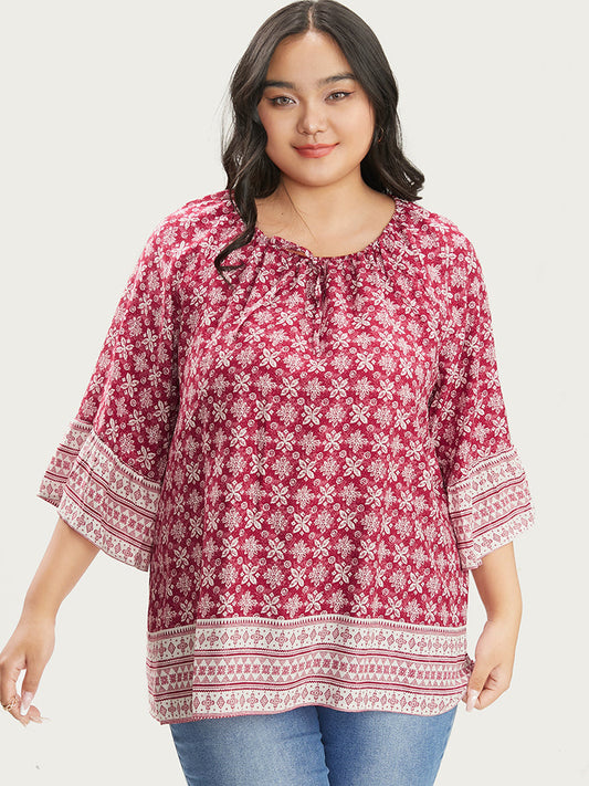 Floral Print Bell Sleeve Knotted Round Neck Blouse