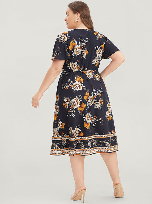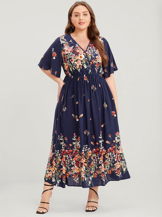 Floral Printed Pocket Surplice Neck Flutter Hem Dress