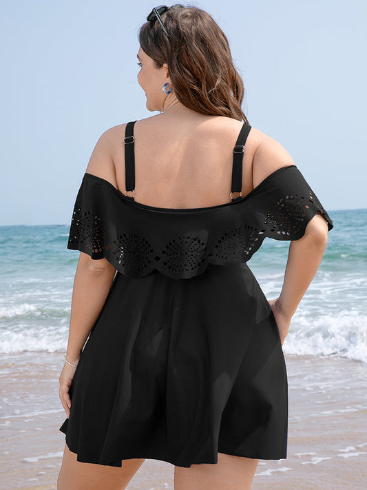 Laser Cut Scalloped Trim Ruffles Cold Shoulder Swim Dress